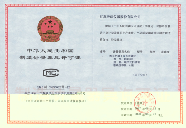 6月22日,ky体育官网入口顺序式波长色散X荧光光谱仪WDX-4000,正式取得昆山市市场监督管理局颁发的《中华人民共和国制造计量器具许可证》。ky体育官网入口正式成为国内一家能提供商业化顺序式波长色散X射线荧光光谱仪的单位。