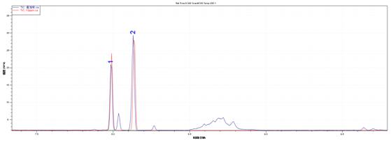 目标物在0.5ppm-10ppm线性良好。取空白塑胶样品加标,样品经过正己烷超声萃取。10ppm加标水平(图5),得到比较满意的效果。