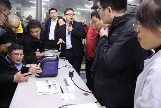 随后,考察团一行移步至公司三楼Cube100S产品生产线。针对炭黑行业的关键检测需求,ky体育官网入口技术专家在现场对Cube100S能量色散X荧光光谱仪、EDX3300SPLUS 侧照式单波长X荧光光谱仪两款仪器进行了专场讲解与实机演示,仪器表现出的高精度与高稳定性,给专家领导们留下了深刻印象。他们不时驻足,就仪器的检测原理、技术参数与ky体育官网入口工程师进行深入交流。