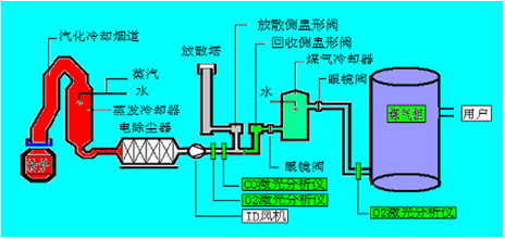 如图2可见,在回收侧盅形阀/分散侧盅形阀前布设烟气在线分析仪,只有当通过CO在线监测系统测得转炉煤气中的CO浓度在30%以上时,才打开气体切换站的回收侧盅形阀进入煤气柜储存,否则通过分散侧盅形阀通过放散塔点火燃烧。在煤气柜前布设烟气在线分析仪,只有在线监测系统测分析保证煤气柜内O2含量不会超标(控制在1%以下)才允许焦煤煤气进入煤气柜,否则启动停止回收,以保证系统的稳定性和安全性。