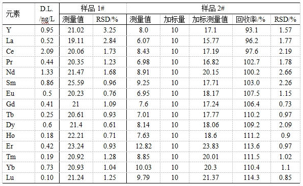参考《GB/T 18115.1-2020 稀土金属及其氧化物中稀土杂质化学分析方法 第1部分:镧中铈、镨、钕、钐、铕、钆、铽、镝、钬、饵、铥、镱、镥和钇量的测定》,将高纯氧化镧用稀硝酸溶解,利用内标法进行校正。考察加标回收率及精密度。方法加标回收率为98.9%~116.9%,精密度为0.28%~9.20%。