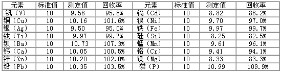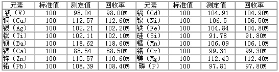 采用本方法测试润滑油金属含量光谱分析标准物质GBW(E)130129、GBW(E)130132,对比实际测定值与标准值,得出实际测试的回收率,得到准确度数据,结果见下表
