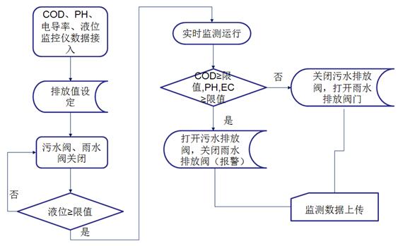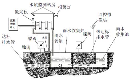 监测系统控制采样单元将水样导入监测室,并启动监测水质的COD、pH、电导率等常规参数。达标雨水通过电控阀门排入市政雨水管网,一旦超标电控阀门关闭,禁止雨水排入市政雨水管网,并通过水泵将超标雨水泵入企业污水处理系统处理,达标后排放至市政污水管网。同时所有监测数据经由数据采集单元将数据统计后,由传输设备传输至企业监测中心或环保局,由此完成对雨水排放自动、实时、连续监控。