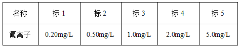 依次用移液枪移取氟离子标准溶液(1000mg/L)0.02mL、0.05mL、0.1mL、0.2mL、0.5mL分别于5个100mL的容量瓶中,用超纯水定容至刻度并摇匀,各标准曲线的浓度详见表1,氟离子的曲线方程及线性如图2所示。