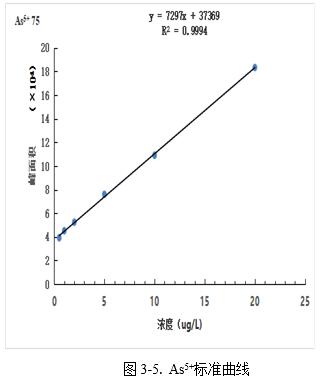 图4为5.0µg/L混和标准溶液色谱图,以各形态峰附近基线处的3倍信噪比(S/N)峰高对应的浓度作为检出限,AsC、As3+、DMA、MMA、As5+分别为0.078µg/L、0.10µg/L、0.11µg/L、0.13µg/L、0.16µg/L。